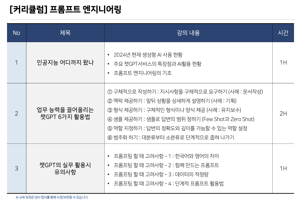 챗GPT의 등장으로 인공지능(AI)은 우리의 일상뿐만 아니라 다양한 산업에 걸쳐 영향력을 점점 확대하고 있습니다. 특히 기업 업무와 공공 행정 및 의정활동에 있어서 AI 기술은 혁신적인 변화를 불러오고 있습니다. 이런 트렌드에 발맞추어 머신러닝과 인공기능의 기초 개념을 충분히 이해하고 챗GPT와 AI를 활용한 프롬프트 엔지니어링까지 체계적인 교육 프로그램을 기획하였습니다.